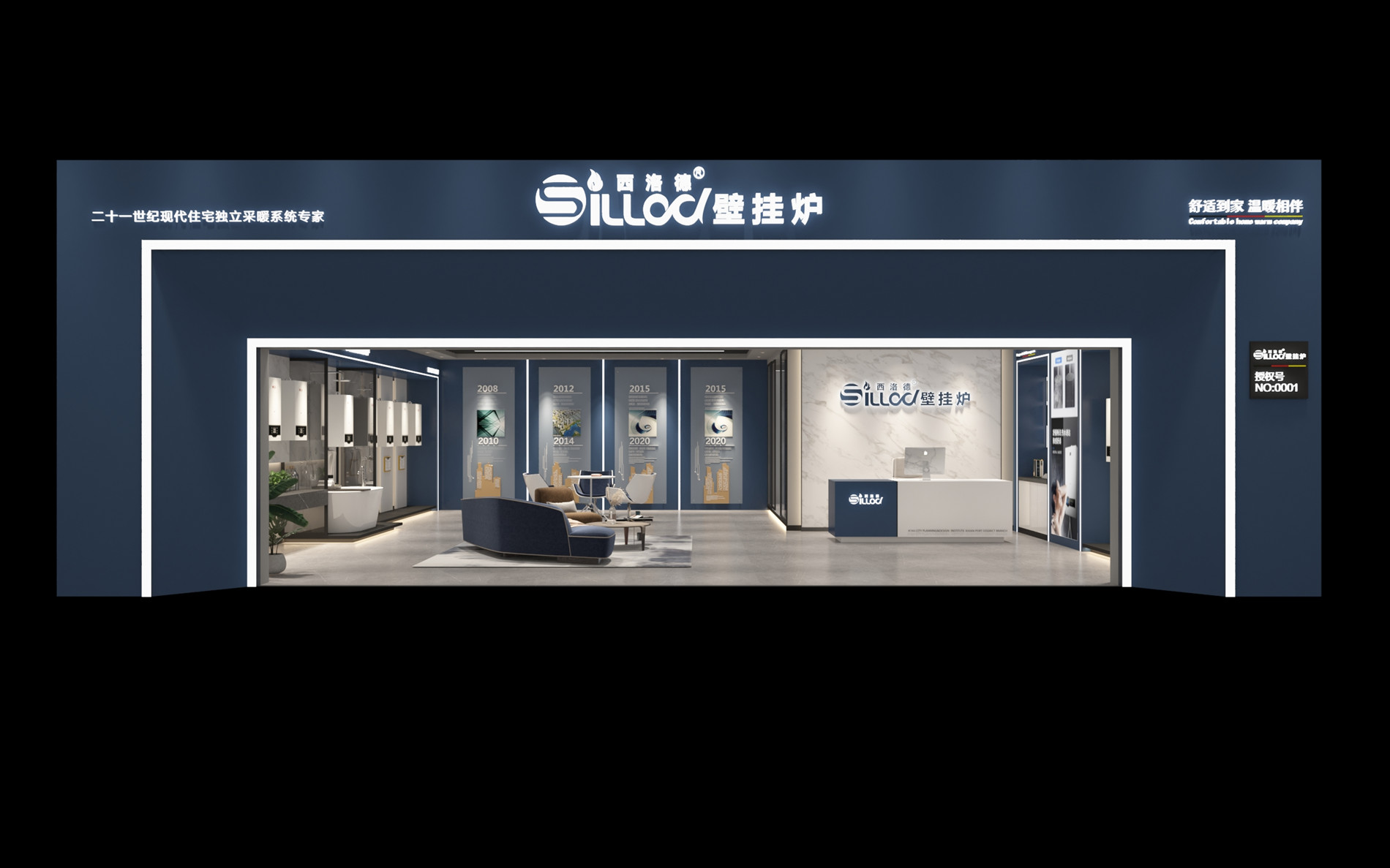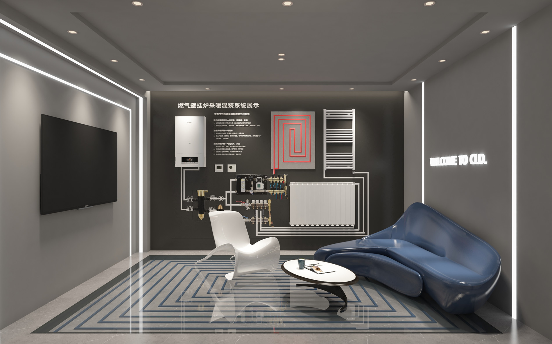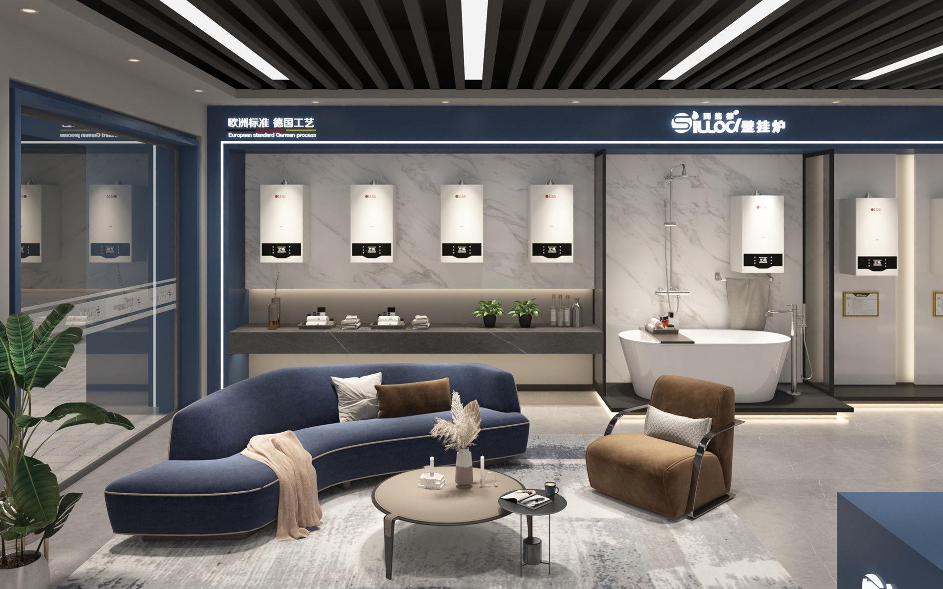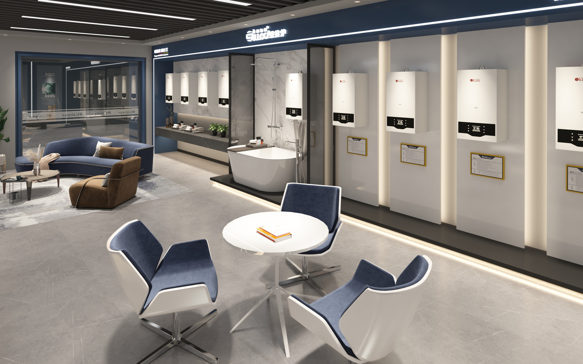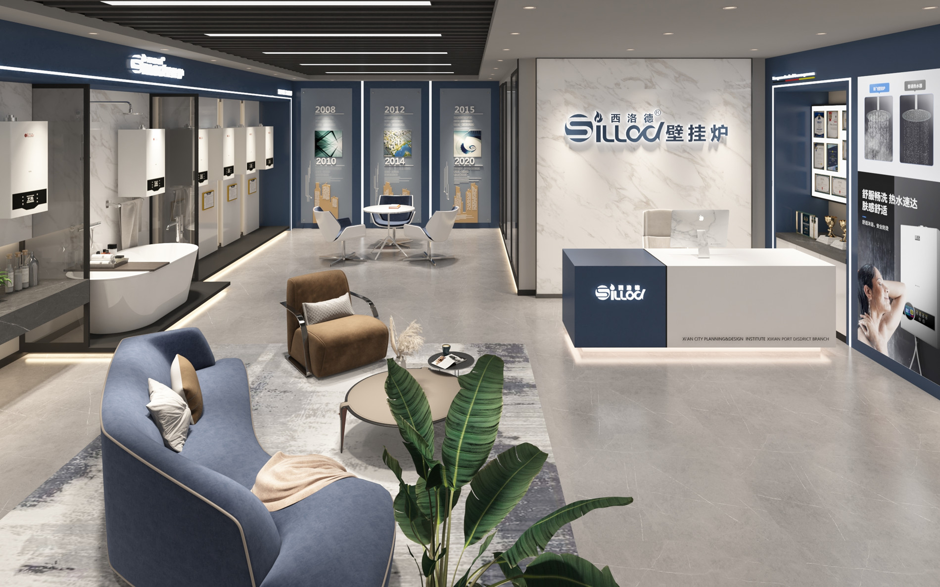 西洛德,深海之藍,與孤獨心靈的交匯。深海之藍的品牌調性——為浮躁的城市心靈營造一處歇腳處。去除華麗裝飾,化繁為簡,簡約輕奢風格,藍白相配,海浪紋地面,給情緒一次零距離深藍海面的機會,突出產品和品牌純靜質感;給人無比放松和享受大海懷抱的體驗。
